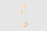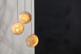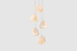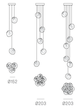 The 118 Random comes in a triple, five or seven pendant drop chandelier on a deep round canopy. Each pendant comes on an adjustable 10ft steel cable. Each glass is 4.5"Ø. and illuminated by 12volt low volt 1.5w LED lamps. Lamps and power supply included.
