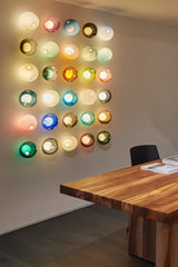 The 28 series pendant(s) resulted from an innovative fabrication process that manipulates both the temperature and the direction of air flow into blown glass. The result is a slightly distorted sphere with an interior landscape of satellite shapes, including an opaque milk glass diffuser that houses either a low-voltage xenon or LED lamp.