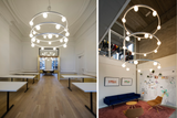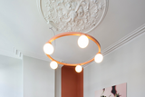 Single hoop suspension outfitted with opal glass globes illuminated with LED source. Four overall size options. Available in the standard finishes of Black or White, with custom colours on request.