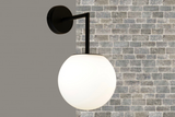 The Bangster wall is a glass globe shade on a 90º arm bracket or an arched arm bracket. Glass shade in option of clear or white glass, and the body comes in the standard finishes of black, white, or polished brass. Custom colours on request.