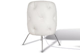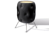 The Chester is a table base side light. The base of fixture is of a tufted upholstery available in white or black leather. The table top is a frosted glass that allows for light diffusion and a surface for your accoutrements.