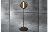 Smoke glass globe with an illuminated alabaster core. Globe accented by two black pleather arms. Body is Dark Bronze