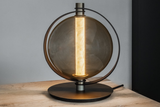 Smoke glass globe with an illuminated alabaster core. Globe accented by two black pleather arms. Body is Dark Bronze