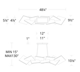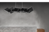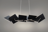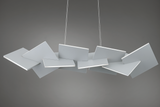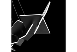 A sculpture of interlocking panels render a thought-provoking aesthetic. Barely visible powered aircraft cables add intrigue. The subtle ambient illumination draws attention to this floating work of modern art.