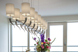 Fabric shaded, soft shaped arms & crystal adorned. This linear chandelier is available in 2 sizes.