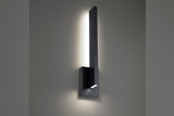 Low-profile wall sconce projects a blade of light on the wall downward to light the path below while featuring its own silhouette.