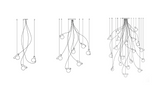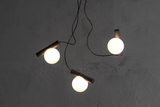 The Node Chandelier uses the language of circles to present a delicate imbalance. Glass spheres trace its perimeter through a steel cylinder, attached at the source of light: an LED, the node. The material contrasts of weight and opacity add to the imbalancing act.