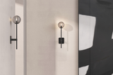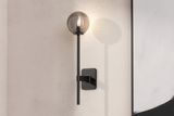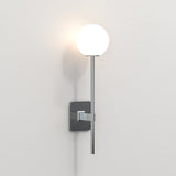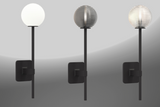 Tall single arm wall sconce available in polished chrome, matt black, or antique brass, finishes with round shade options of smooth opal white glass or in a ribbed glass dome option in white, clear or smoke glass.
