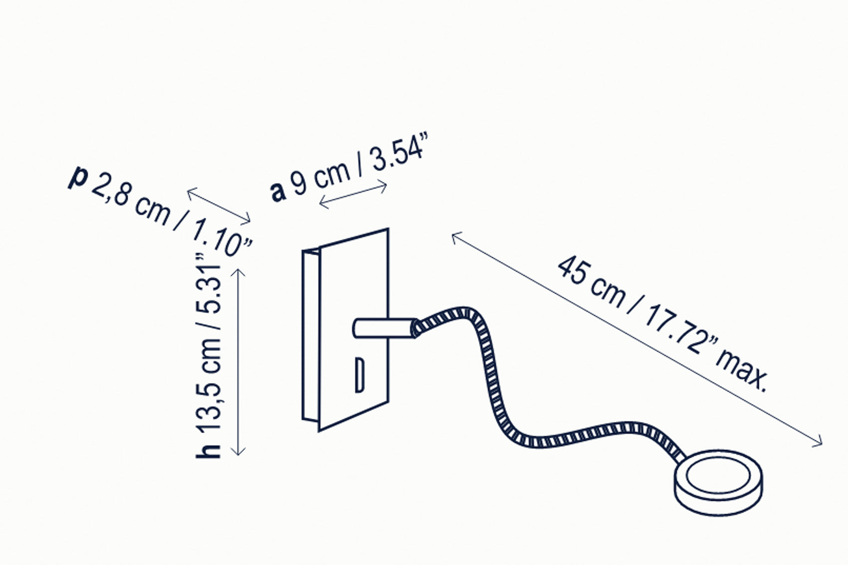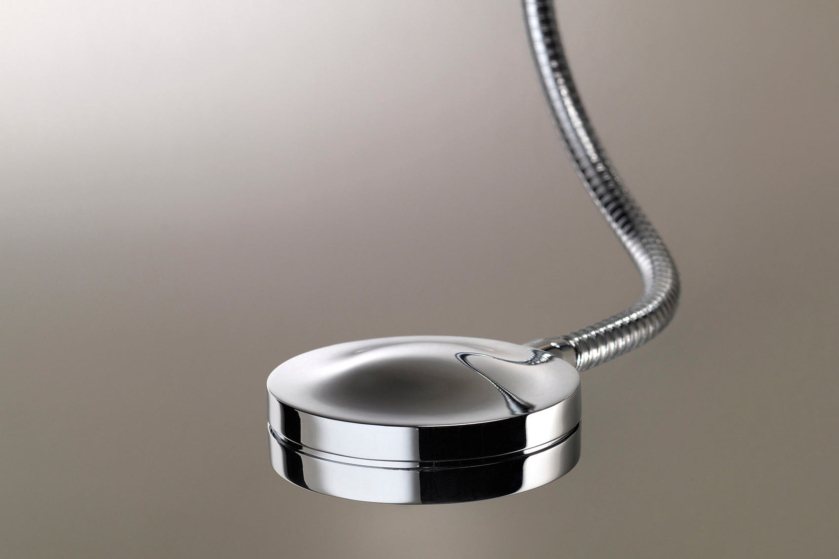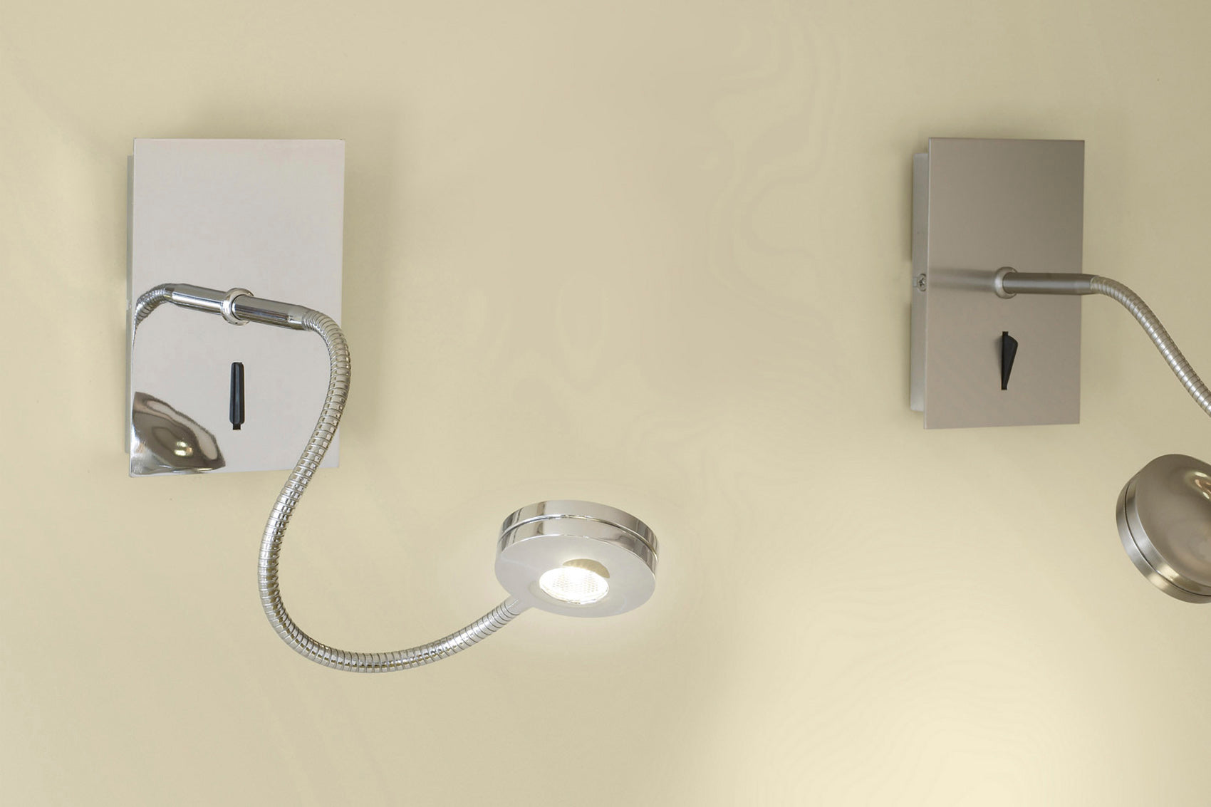 Wall light with flexible, yet rigid brass Flexo arm, Zamac mold injected hood houses LED lighting and vertical 2” x 4” rectangular junction box. Electrical switch mounted on back plate. Finish is brilliant chrome.
