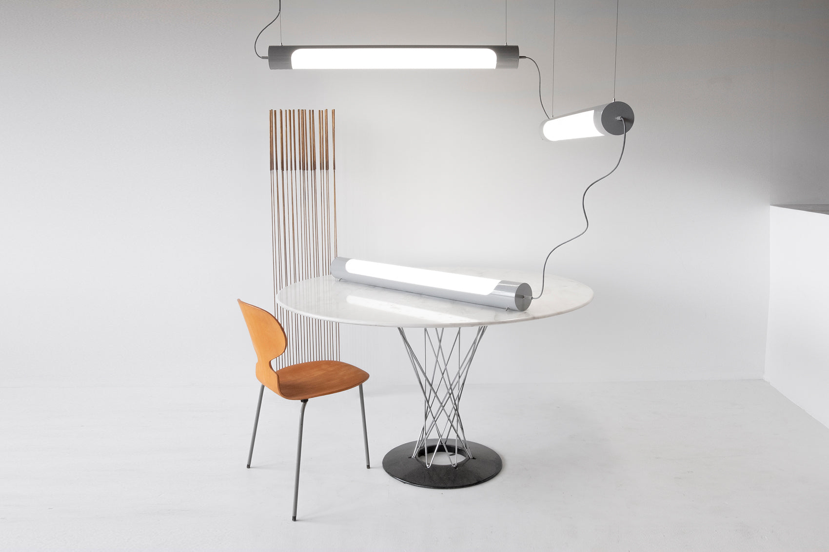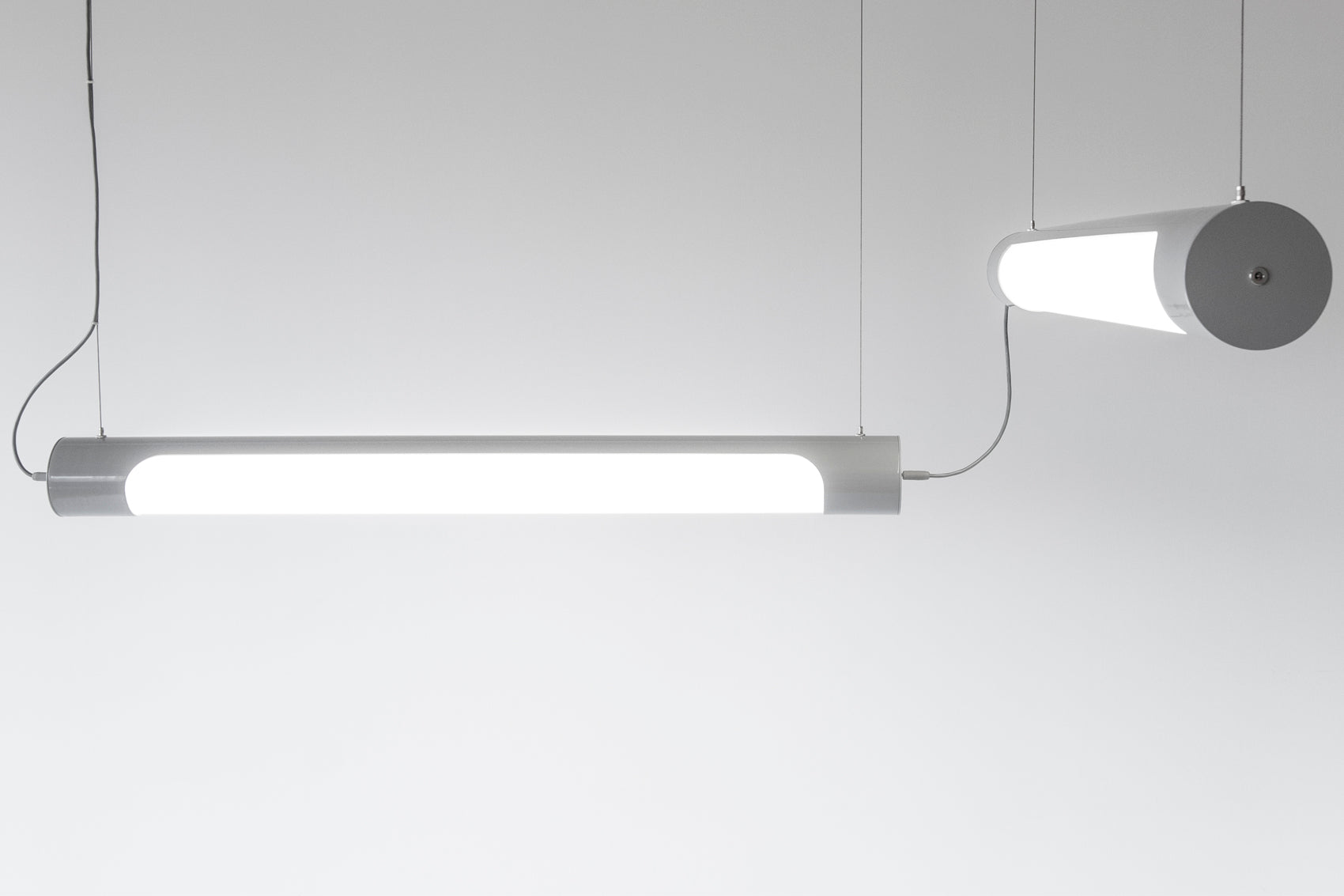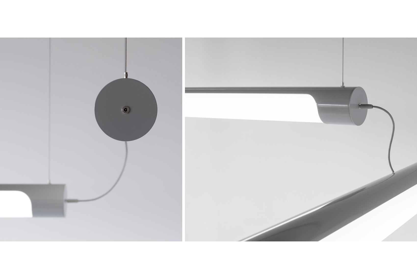 “Middle Grey” is the name given to the 18% black shade that appears to the eye to be halfway between black and white. The Middle Grey Pendant is made from laser-cut extruded aluminum tube, and uses an Acrylite® Satinice diffuser to enhance the light from its integral LED source. The pendant lights are linkable between their barrel jack end caps.