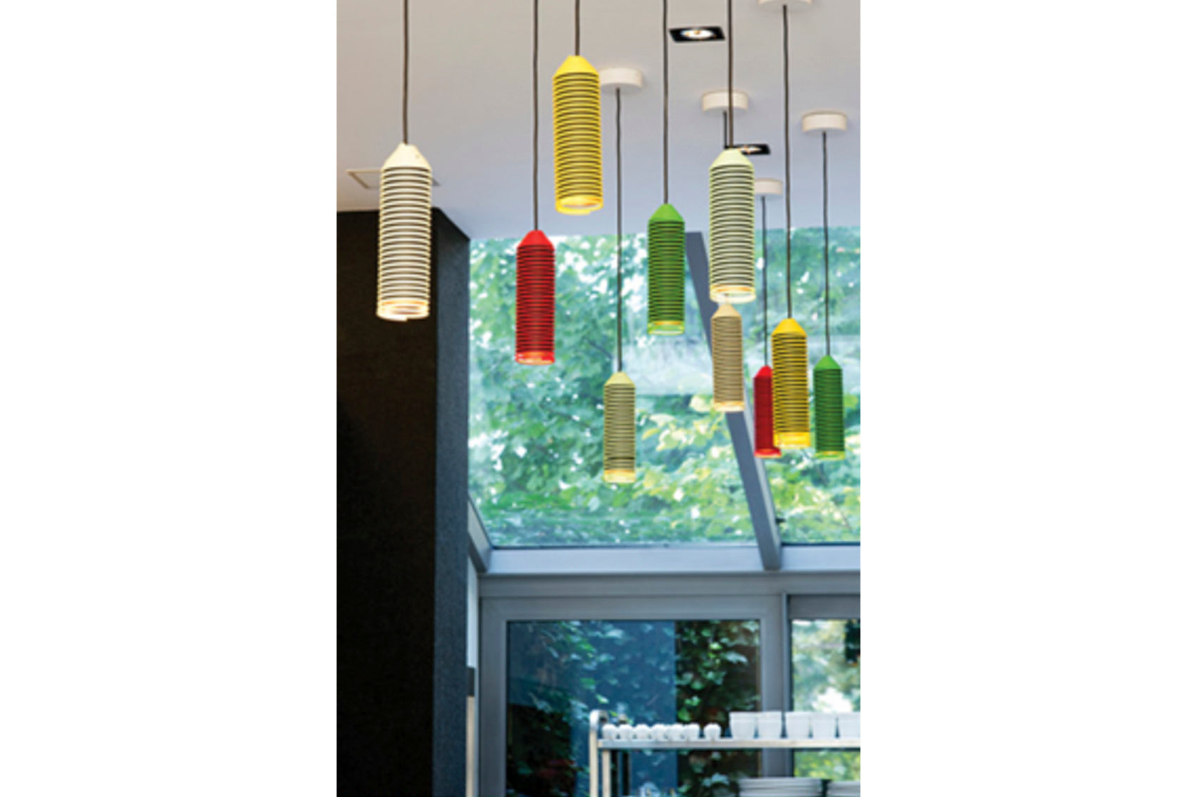 - Shade is 9" x 2.75" Ø and comes with 5ft adjustable suspension cables.