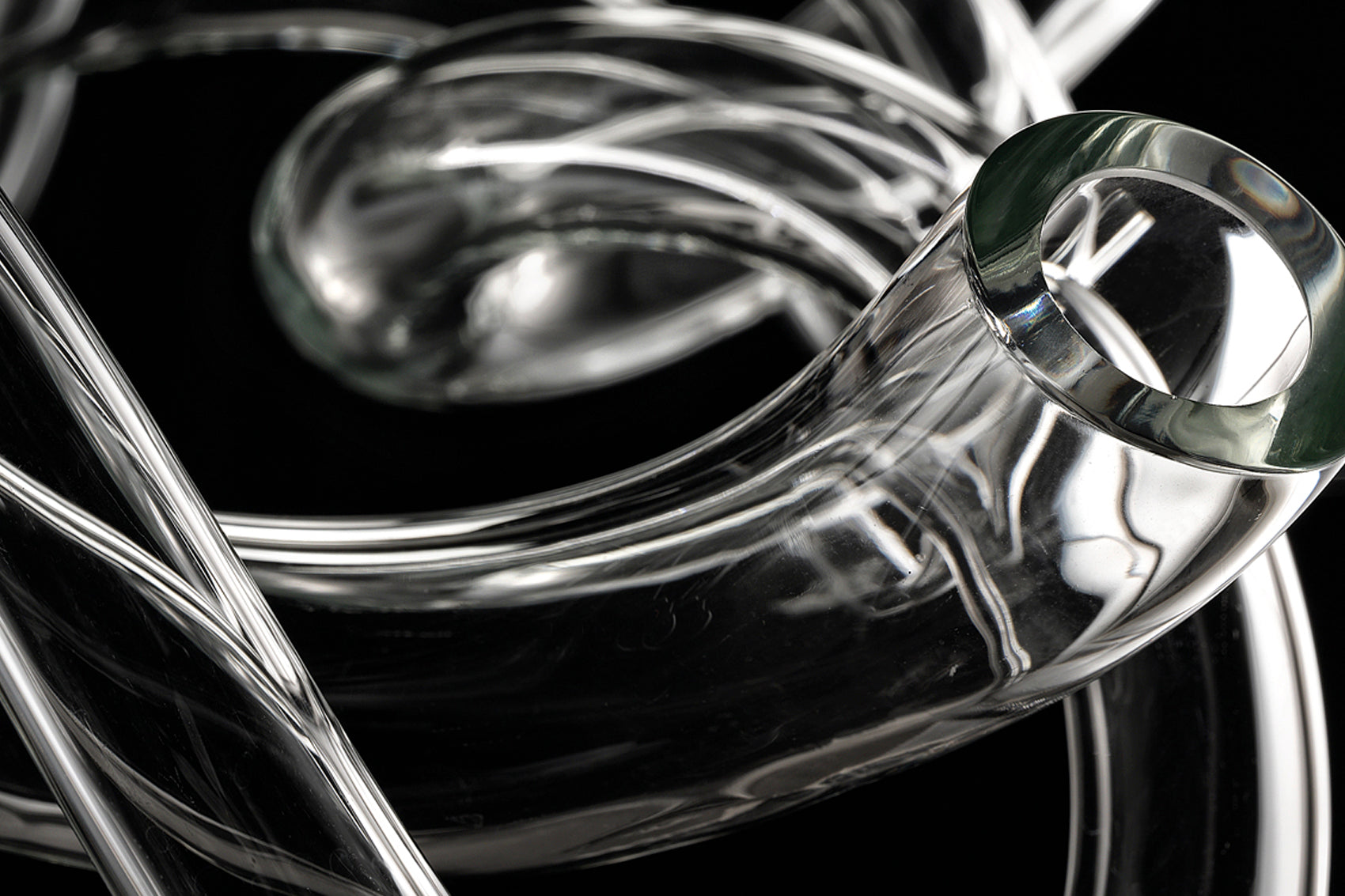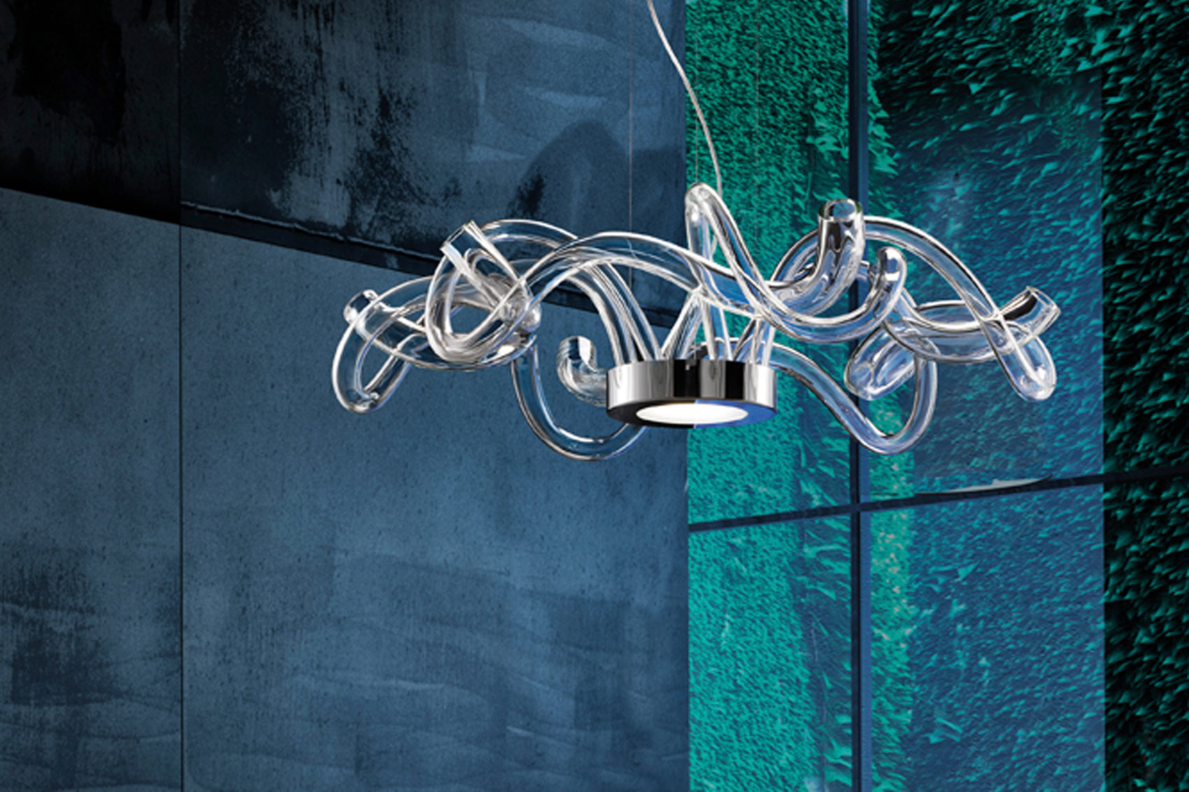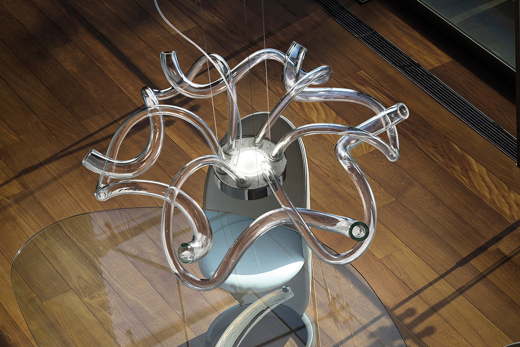 Suspension with hand shaped clear glass elements escaping from chromed central disc with LED illumination.