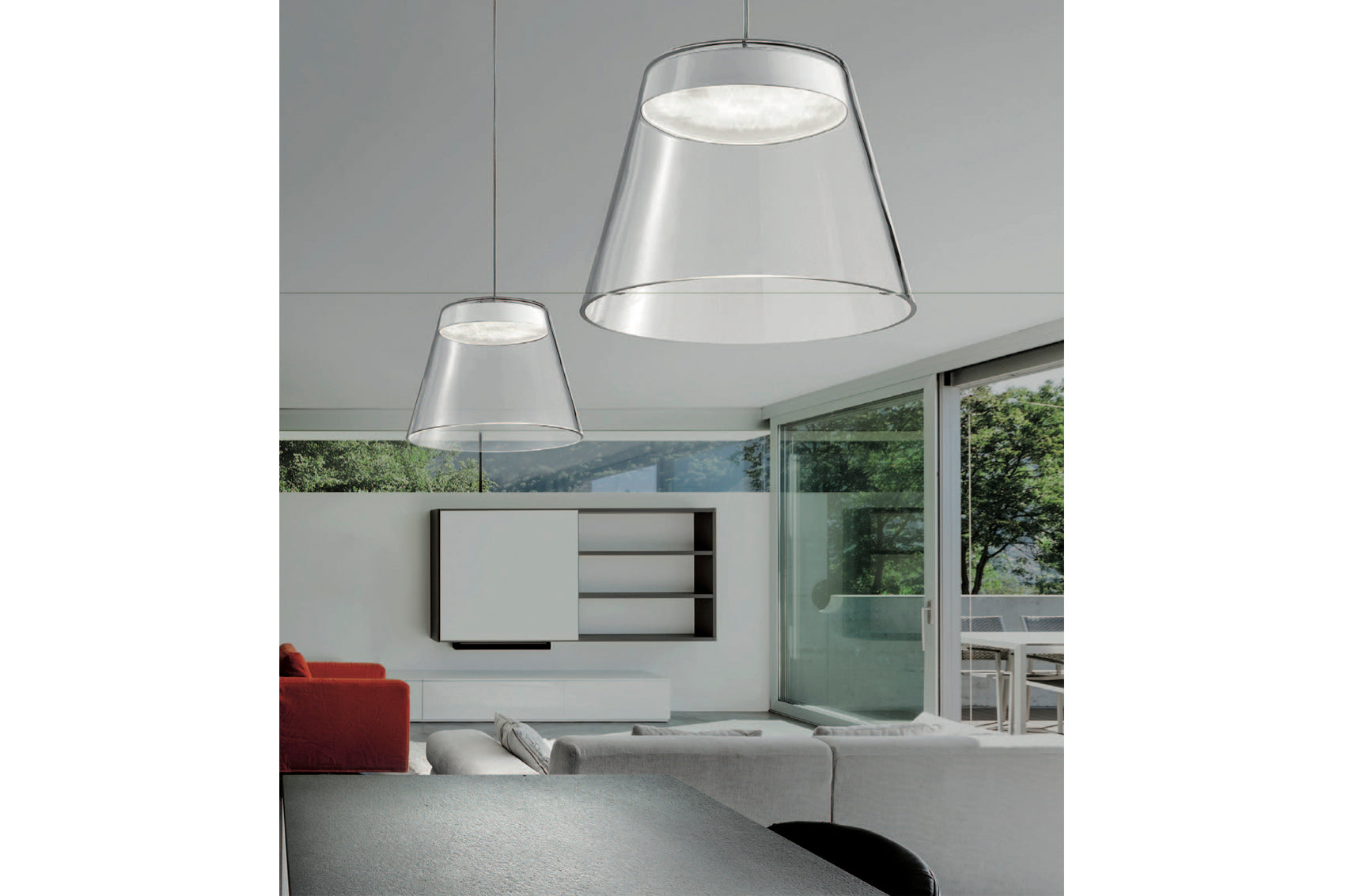 Clear glass shade suspensions on polished white lacquered metal structure with acrylic micro-prism diffuser.