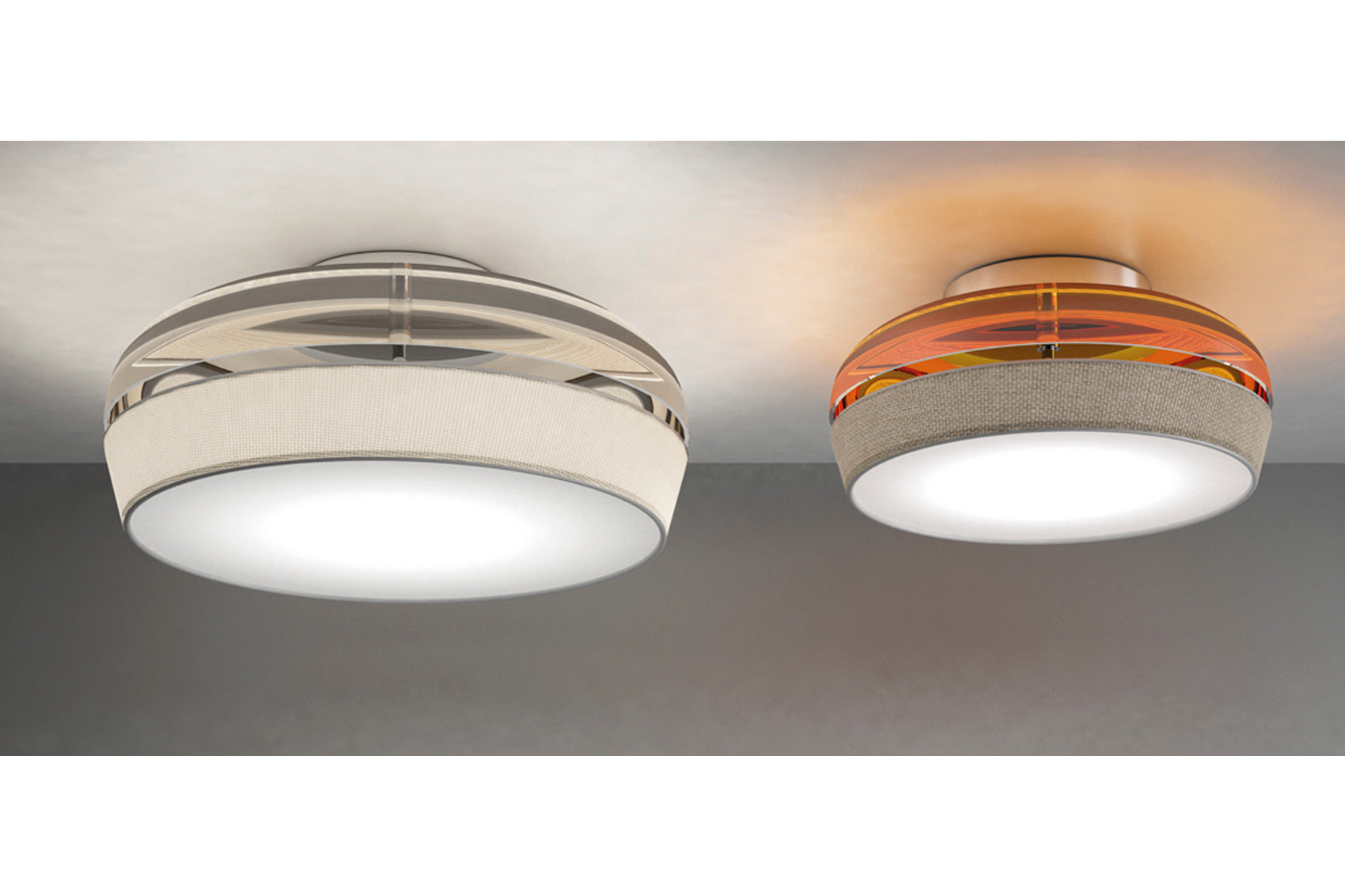 Transparent glass in option of turtle-dove grey with ivory white fabric shade &  Orange with turtle-dove grey linen style shade. Structure is chromed metal.