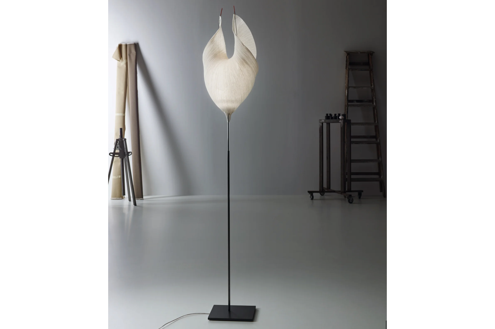 Paper, metal, stainless steel, silicone. Babadul is both a floor lamp and a light object, which emanates positively and unmistakably on spaces. The paper sheet hovers at the end of a slender metal rod, like a large abstracted flower petal. Just as in all other MaMo Nouchies, the lampshade consists of Japanese paper, which has to undergo a special manufacturing process in Dagmar Mombach’s studio, until the desired shape is achieved. The light source is an LED module, provided with a cooling element, developed by Ingo Maurer especially for the MaMa Nouchies. Its light is so warm and soft, that any difference can hardly be noticed when compared to conventional halogen light sources.