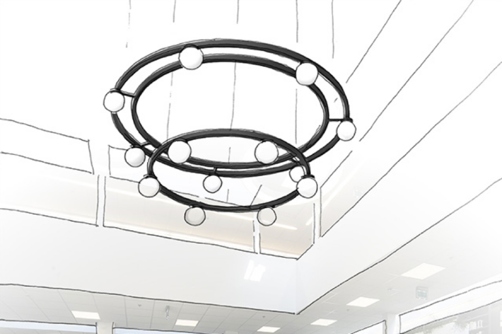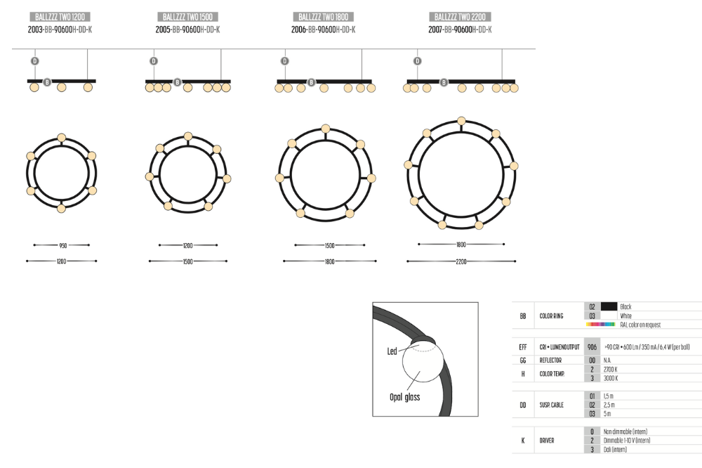Double hoop suspension outfitted with opal glass globes illuminated with LED source. Four overall size options. Available in the standard finishes of Black or White, with custom colours on request.