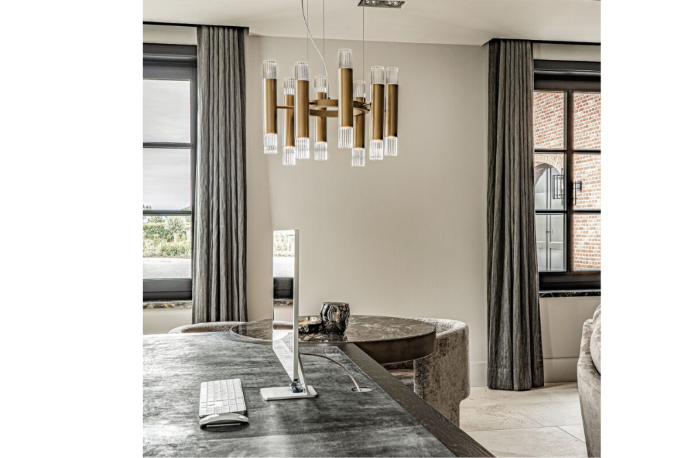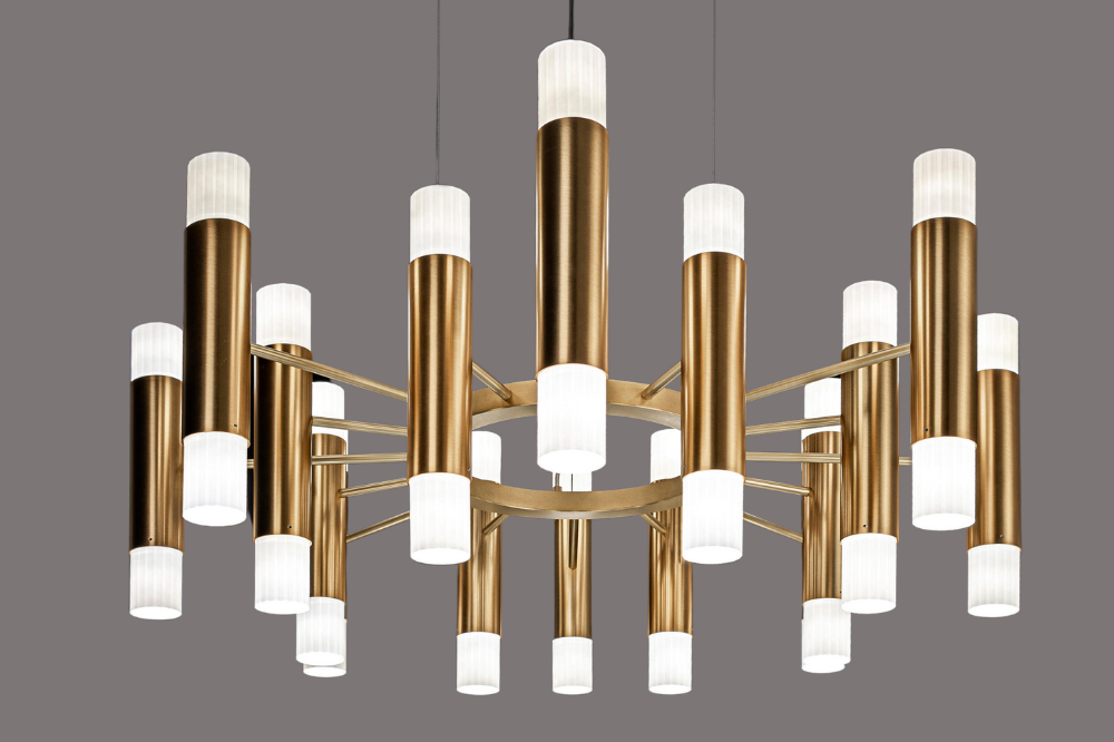 An elegant and impactful chandelier that will amaze you from every angle. Available in a 10 arm and 16 arm option; Each arm provides both up and down lighting that is diffused from fluted glass shades.