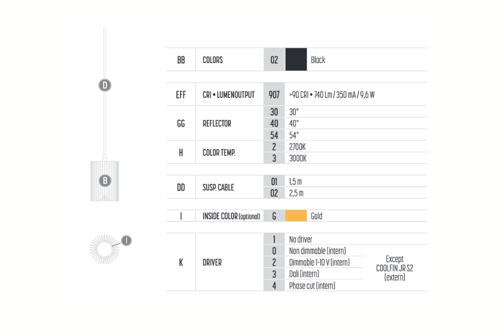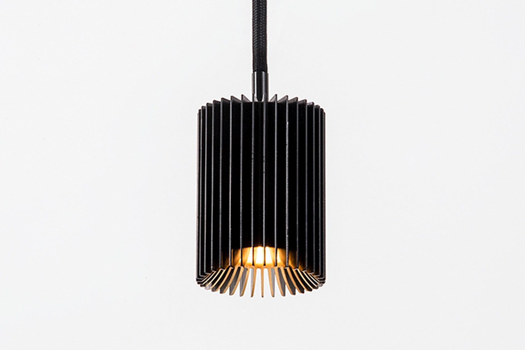 'Finned' LED pendant @ 9.6w each with option for beam spread and colour temperature. LED reflector has optional gold finish.
