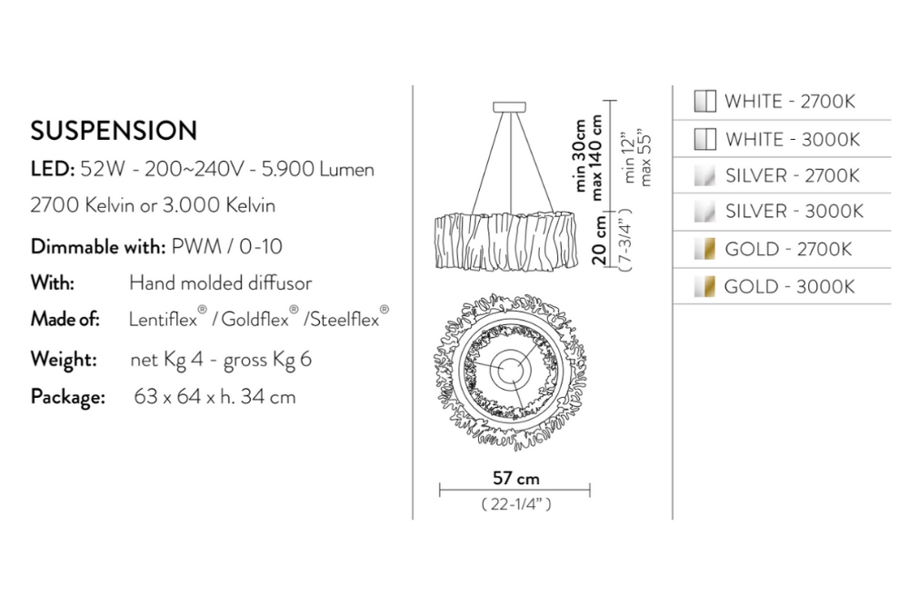 The Accordèon 22"Ø suspension is a ruched iridescent shade with gold, silver or white interior detail finish.