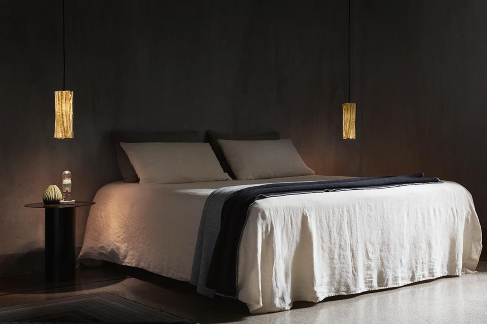 The Accordèon vertical shaded pendant is a cylindrical shade available in either Prisma or gold, connected to the ceiling with a black-wrapped cable and a glossy ceiling rose.