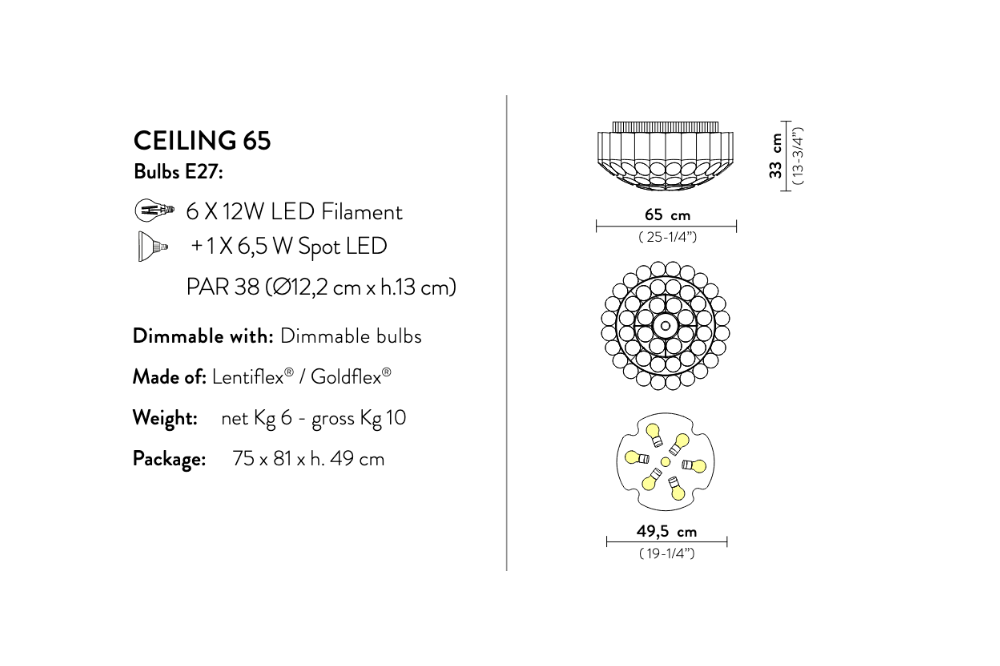 Odeon ceiling light pays homage to the theatre, the dramatic arts, and joie de vivre. Available in two sizes; with a diameter of 65 or 100 cm, with concentric crowns of coupled metallic Goldflex and Lentiflex, a glasslike rippling technopolymer.
