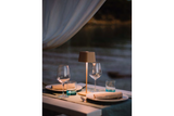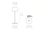 Battery-operated and rechargeable portable table lamp with a soft square profile and conversation-size height.