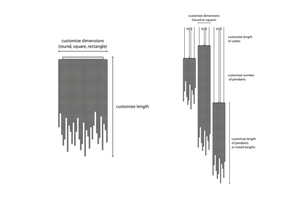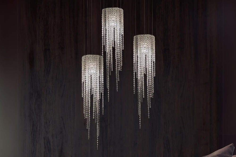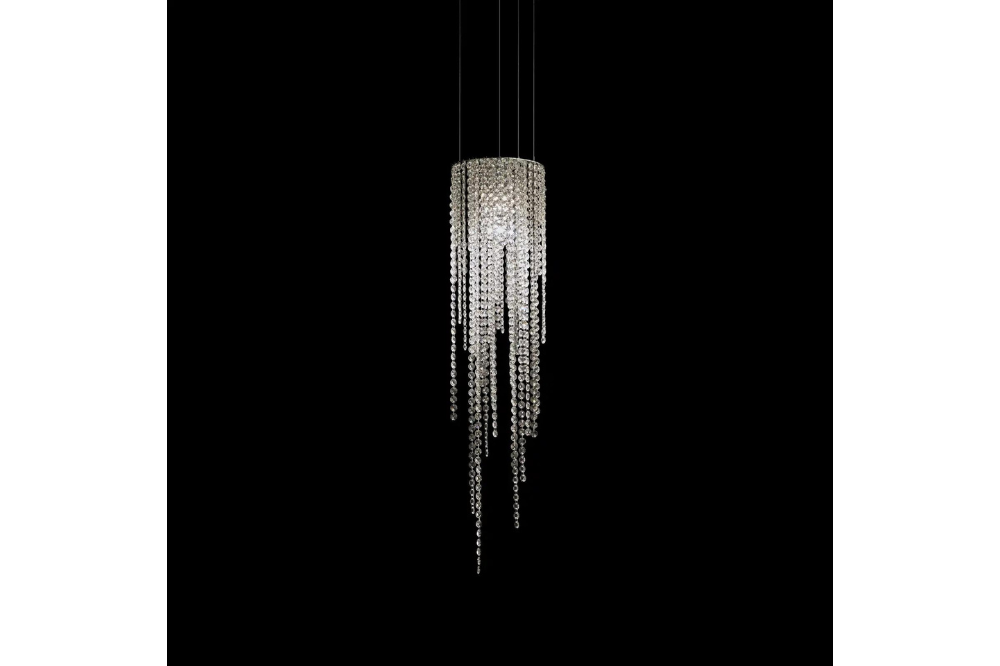 Cascading premium crystal pendants with single light source. Available in 3 overall lengths, each a 8" diameter.
