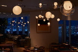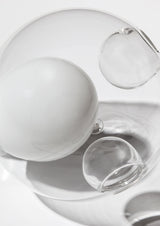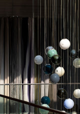 The 28 series pendant(s) resulted from an innovative fabrication process that manipulates both the temperature and the direction of air flow into blown glass. The result is a slightly distorted sphere with an interior landscape of satellite shapes, including an opaque milk glass diffuser that houses either a low-voltage xenon or LED lamp.