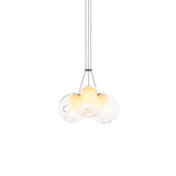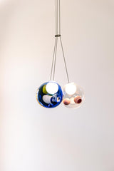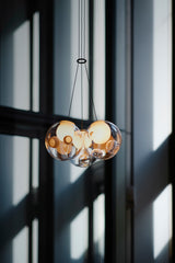 The 28 series pendant(s) resulted from an innovative fabrication process that manipulates both the temperature and the direction of air flow into blown glass. The result is a slightly distorted sphere with an interior landscape of satellite shapes, including an opaque milk glass diffuser that houses either a low-voltage xenon or LED lamp.