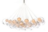 The 28 series pendant(s) resulted from an innovative fabrication process that manipulates both the temperature and the direction of airflow into blown glass. The result is a slightly distorted sphere with an interior landscape of satellite shapes, including an opaque milk glass diffuser that houses either a low-voltage xenon or LED lamp.