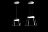 Clear glass shade suspensions on polished white lacquered metal structure with acrylic micro-prism diffuser.