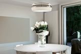 Transparent glass in option of turtle-dove grey with ivory white fabric shade &  Orange with turtle-dove grey linen style shade. Structure is chromed metal.