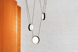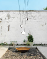 These elegant, individually-weighted disks balance on custom made taut electrical cables that are produced with a matte finish. This allows the cables to lightly trace shapes in three-dimensional space, creating flexibility to frame any room setting or furniture arrangement.