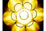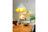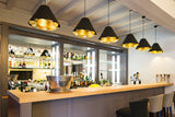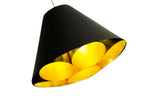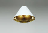 Conical pendant in white or black with round golden reflectors inside that project a fantastic warm light.