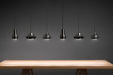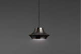 Tibeta03 is part of a family of 3 pendant lights made of spun aluminum. Tibeta includes a led module inside which provides direct bottom light. Impeccably finished in black chrome with black fabric cord.