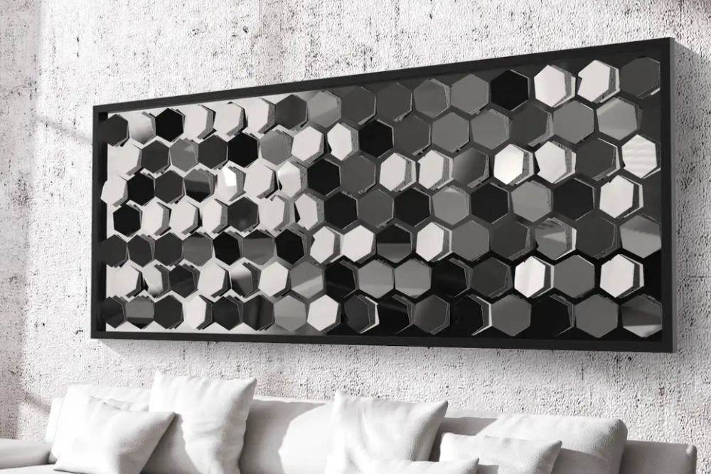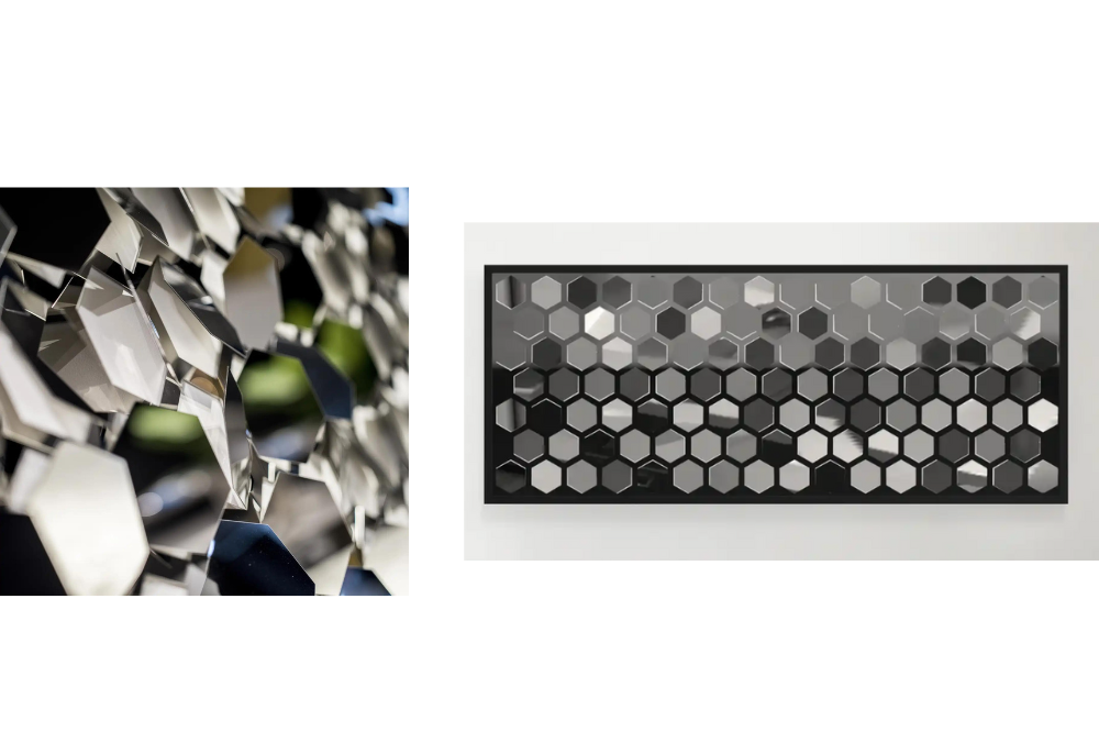 The artistry of glass and light. Delusion is a mesmerized composition of clear sparkling mouth-blown glass which leads us to infinity in the reflections of the high polished mirror steel finish of the frame plate.