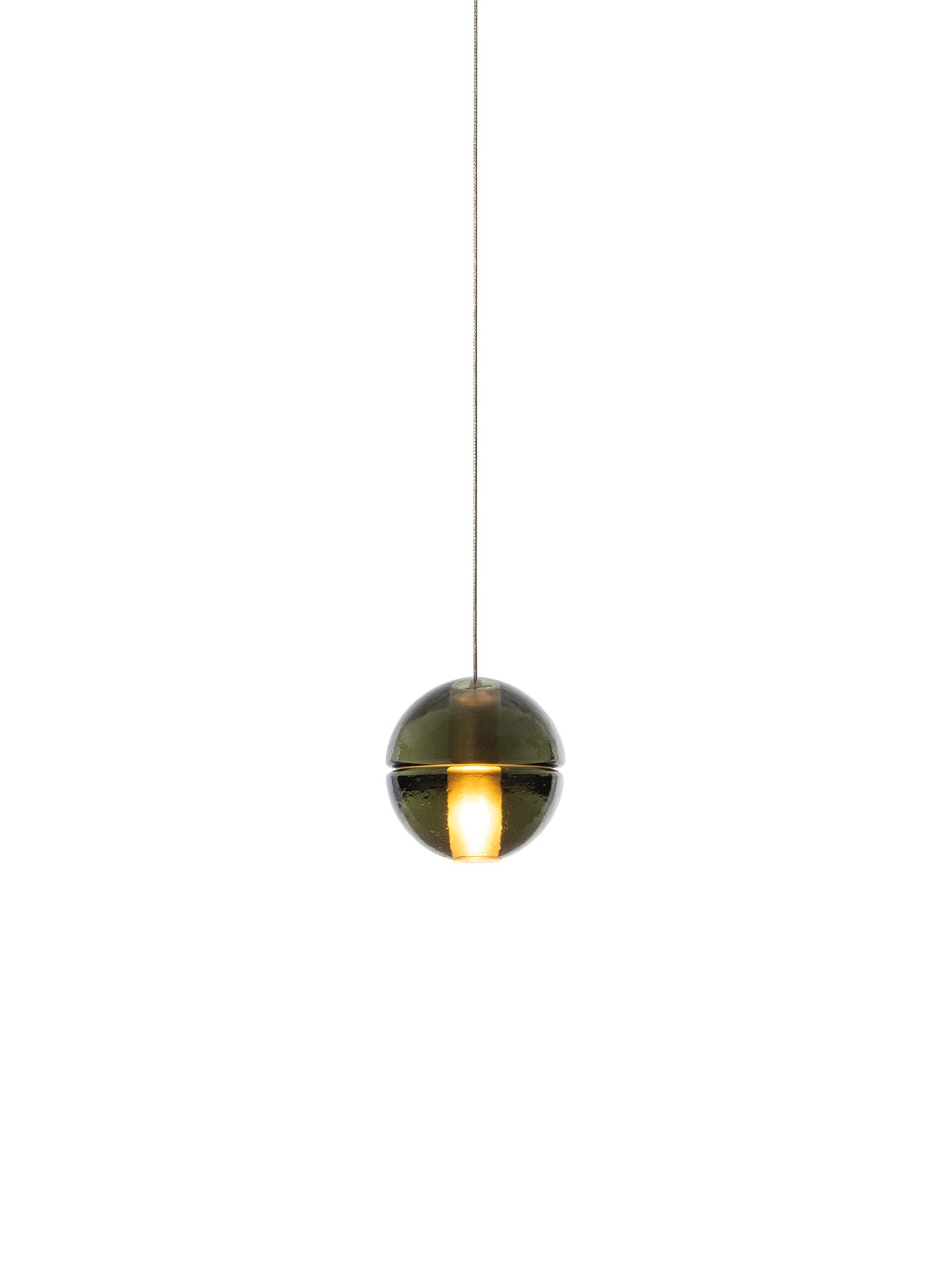 14.5 is composed of single cast-glass pendants on field adjustable 3m steel cables. Glass is available in clear, amber or grey. Each glass is 4"Ø