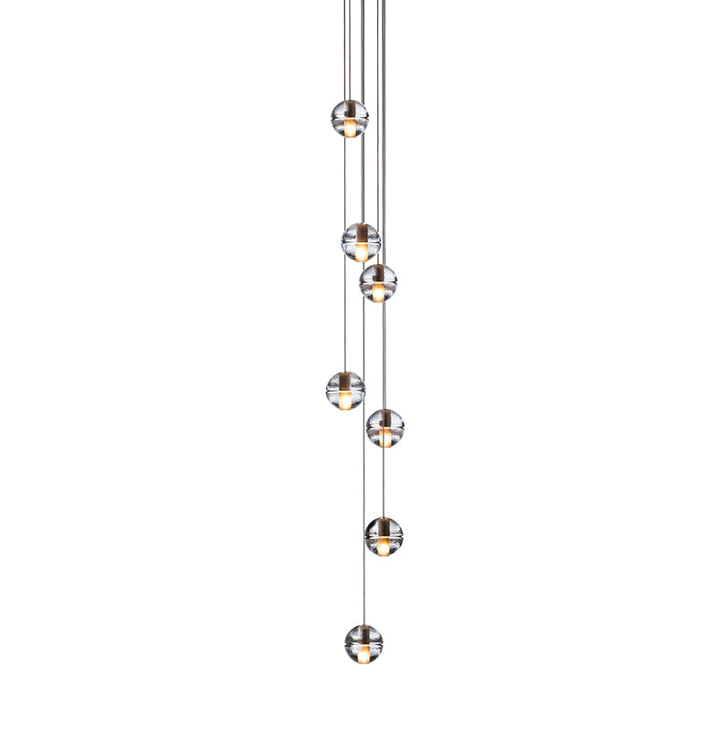 14.7 is composed of single cast-glass pendants on field adjustable 3m steel cables. Glass is available in clear, amber or grey. Each glass is 4"Ø