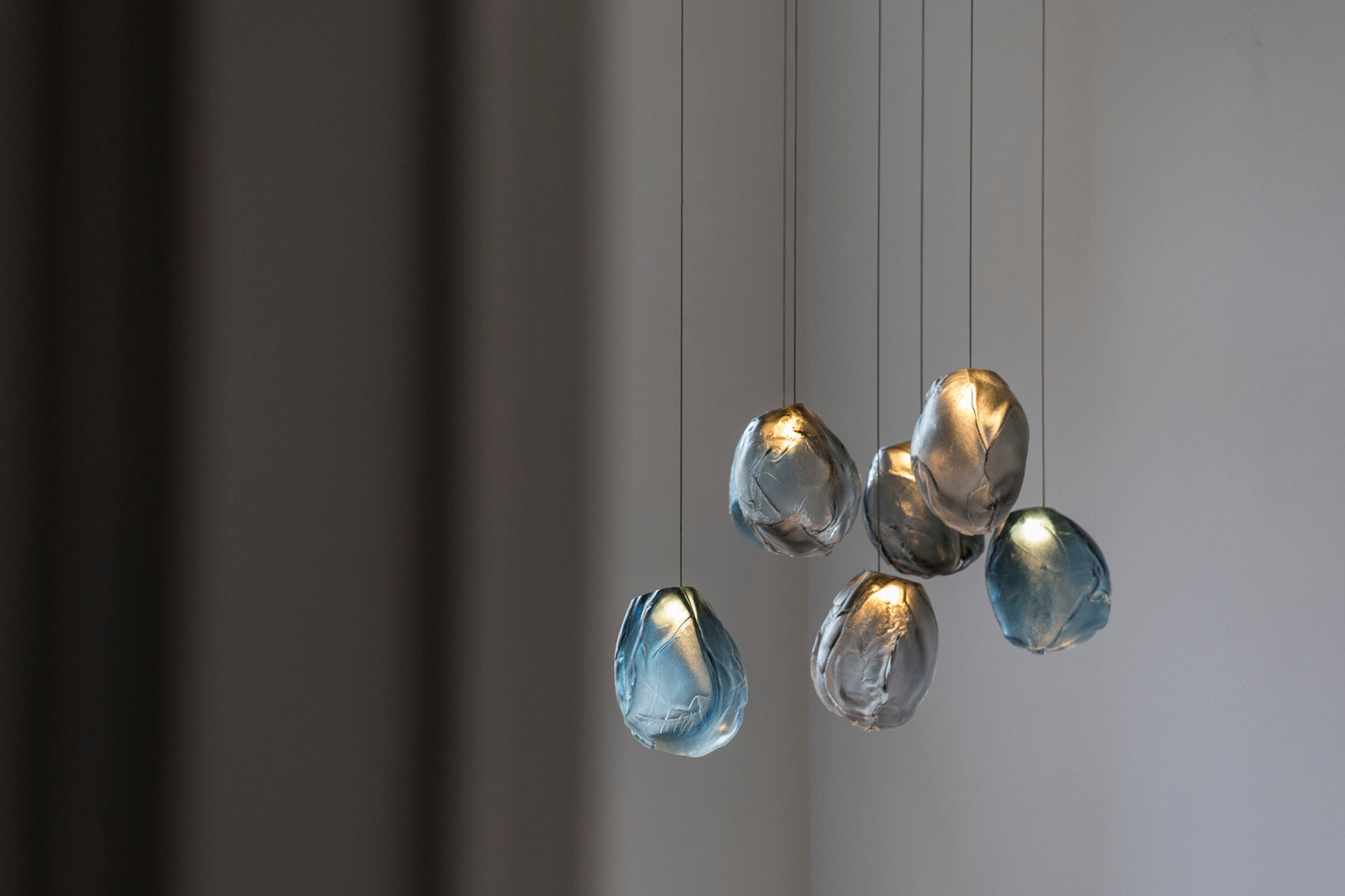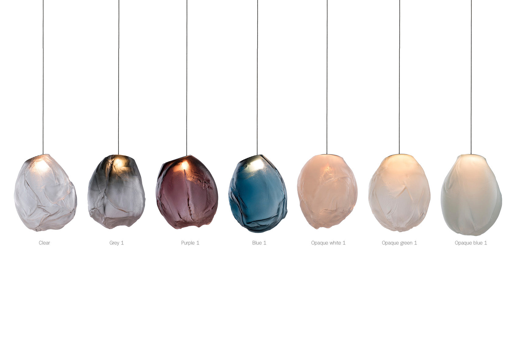 A light source is positioned at the top of each pendant, accentuating the volumetric perception of the piece as well as the gradation of colour.