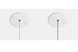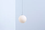 Glass 01 is a solid opal glass orb that casts a warm ambient glow - suspended in space by slim suspension cable.