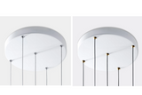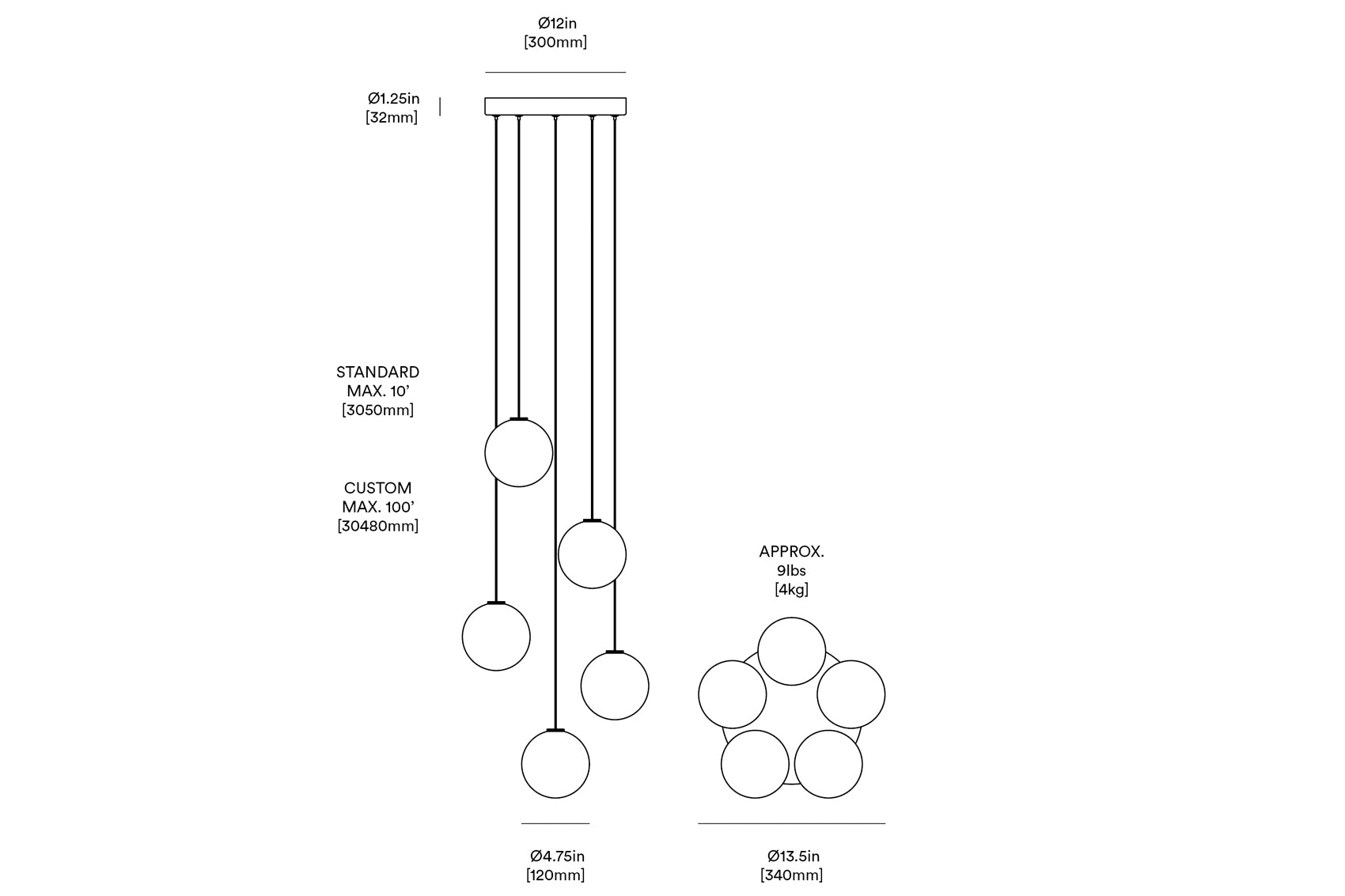 Glass 05 is a 5 light variation with solid opal glass orbs that cast a warm ambient glow - all suspended in space by slim suspension cables.